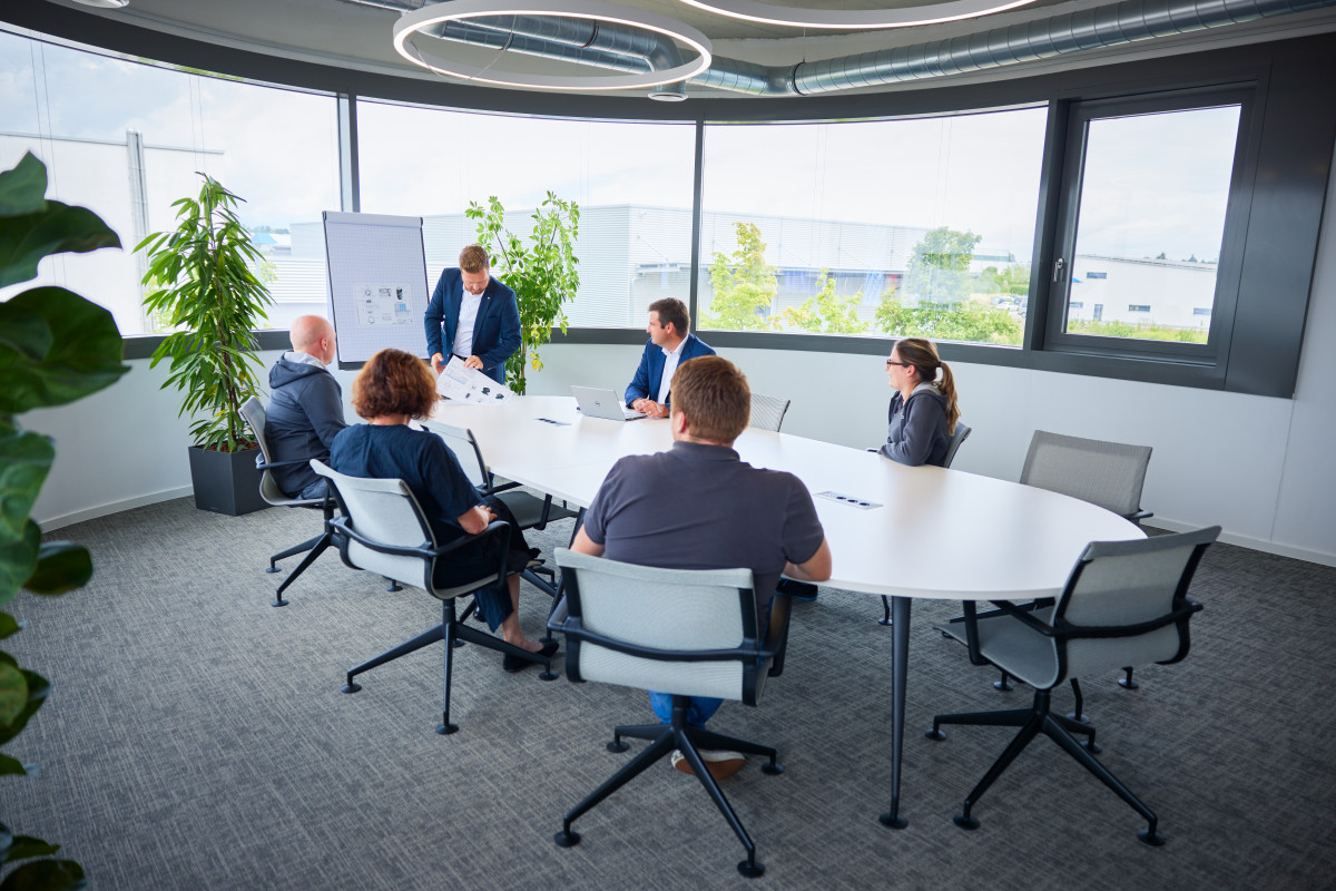 Nachher: wandlungsfähiger Neubau – Produktionshalle und Büros mit einer Nutzfläche von 6.000 m². Ausbaufähige Planung: Die Produktionshalle kann in einem zweiten Bauschritt erweitert werden. „Innere Werte“: offene Hallen und Büros auf zwei Stockwerken. Funktionales Bürokonzept: nur ein Raum pro Stockwerk. Die einzelnen Bereiche entstehen erst durch die Einrichtung. Dadurch ist nichts in Stein gemeißelt, sondern die Räumlichkeiten sind jederzeit leicht und kostensparend adaptierbar. Mehrwert des Bürokonzeptes: kurze Kommunikationswege, flexible Zusammenarbeit, Team-Building inkludiert. Auf dem Prüfstand: Das Konzept bewährt sich seit bald drei Jahren.