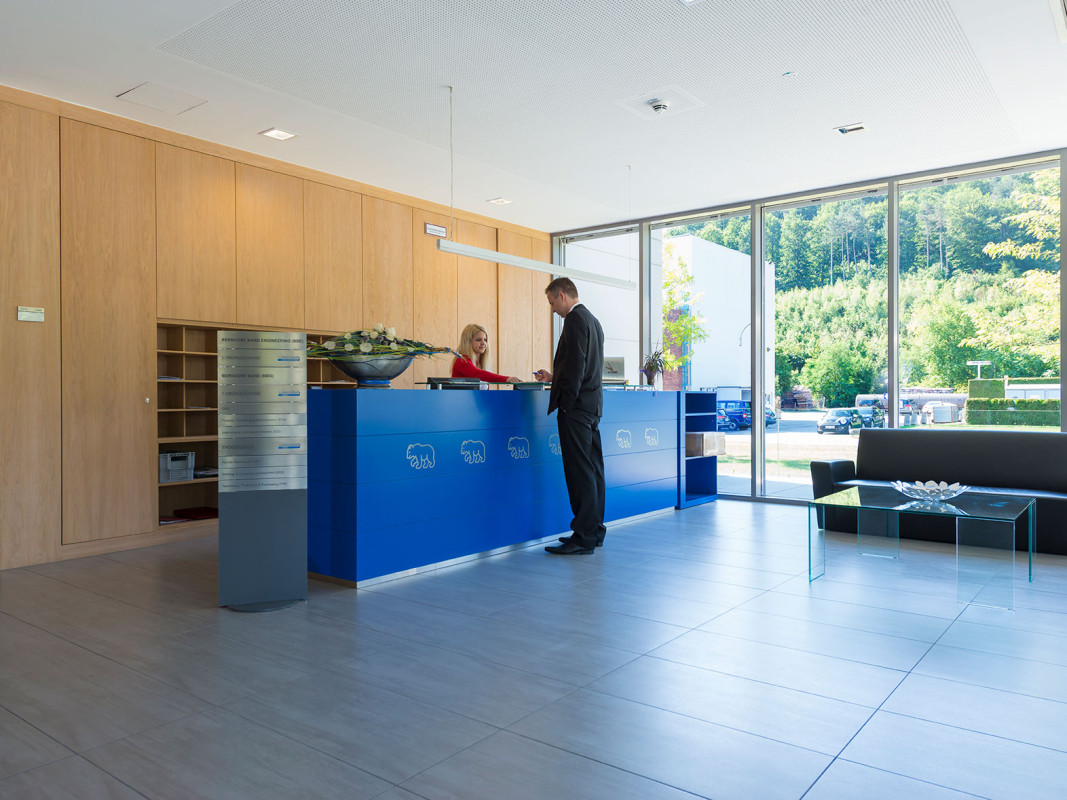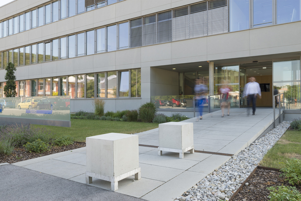 Nachher: viergeschoßiger Büroneubau in Skelettbauweise mit vorgesetzter Fenster- und Plattenfassade. Am Puls der Zeit: durch modernste IT-Ausstattung. Unter einem Dach: Alle Mitarbeiter:innen arbeiten im selben Gebäude. Ausbaufähig: Der Neubau ist durch eine vorausschauende Planung um ein weiteres Stockwerk erweiterbar. Klimaschutz: Eine Luftwärmepumpe heizt und kühlt das Gebäude. Freiräume: Im Erdgeschoß ist Platz für kreatives Arbeiten.